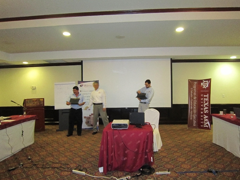 SAN SALVADOR, 26 de abril de 2013. A finales de abril se llevo a cabo el Programa Ejecutivo “Inventory Management” en San Salvador dictado por el Dr. Jorge León y el Dr. Daniel Jornada, ambos académicos de la Universidad de Texas A&M, College Station. Como siempre se realizó en alianza con la Fundación de ExAlumnos de Texas A&M en El Salvador, e IT Consulting SA de CV, empresa orientada a asesorar a sus clientes en estrategias corporativas de tecnologías de la información, rediseño de procesos e innovación y su integración con el negocio. El Dr. Jorge León, es miembro de la facultad del Departamento de Tecnología de la Ingeniería y de Distribución Industrial de la Universidad de Texas A&M en College Station, miembro de la facultad del Departamento de Ingeniería Industrial y de Sistemas de la Escuela de Ingeniería Dwight Look de la misma universidad y Director del programa de Ingeniería Mecánica y Tecnologías de Manufactura y es uno de los Directores de la Iniciativa de Manufactura Global y de Investigación en Distribución en la Universidad de Texas A&M. Junto a él lo acompañó el Dr. Daniel Jornada, investigador del centro de Manufactura Global y de Investigación en Distribución en la Universidad de Texas A&M. Llegaron participantes de Honduras, Guatemala, y El Salvador.